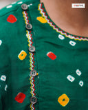 Long kurtas in cotton & satin mix with handmade Bandhani. Delicate embroidery detailing in bandhani colors on button lapel, sleeves & neck for some added glamour.