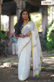 Presenting “Rāmāyaṇa” Saris in Kasavu - an exquisite pure handloom Kasavu sari from the Kuthampilly looms with the Eka Shloki Rāmāyaṇa embroidered in Saffron font on the gold kasavu border & bow & arrow sets sprinkled in the first 2 mtrs of the sari from the pallu end. The aanchal of the sari is finished with beautiful saffron silk tassles.