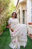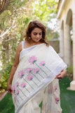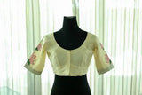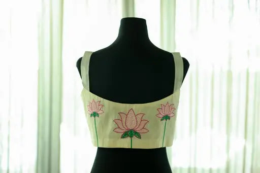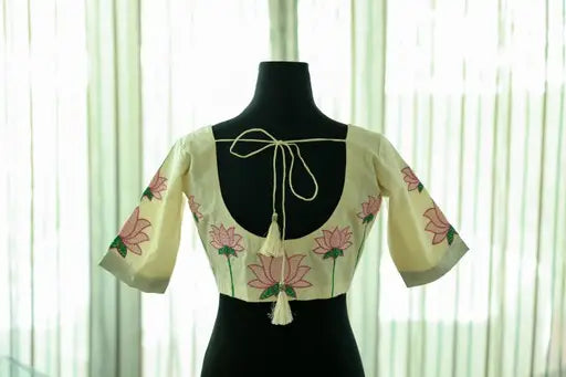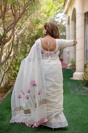 Taamarai Cholis stitched to fit in pure handloom Kasavu with silver kara or border from the Kuthampilly looms embellished with lotuses embroidered on both sleeves & back of the Cholis with intricate workmanship.